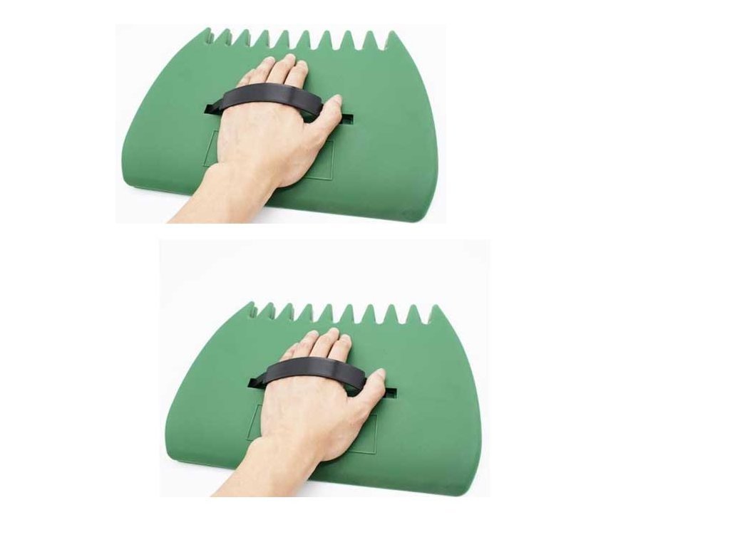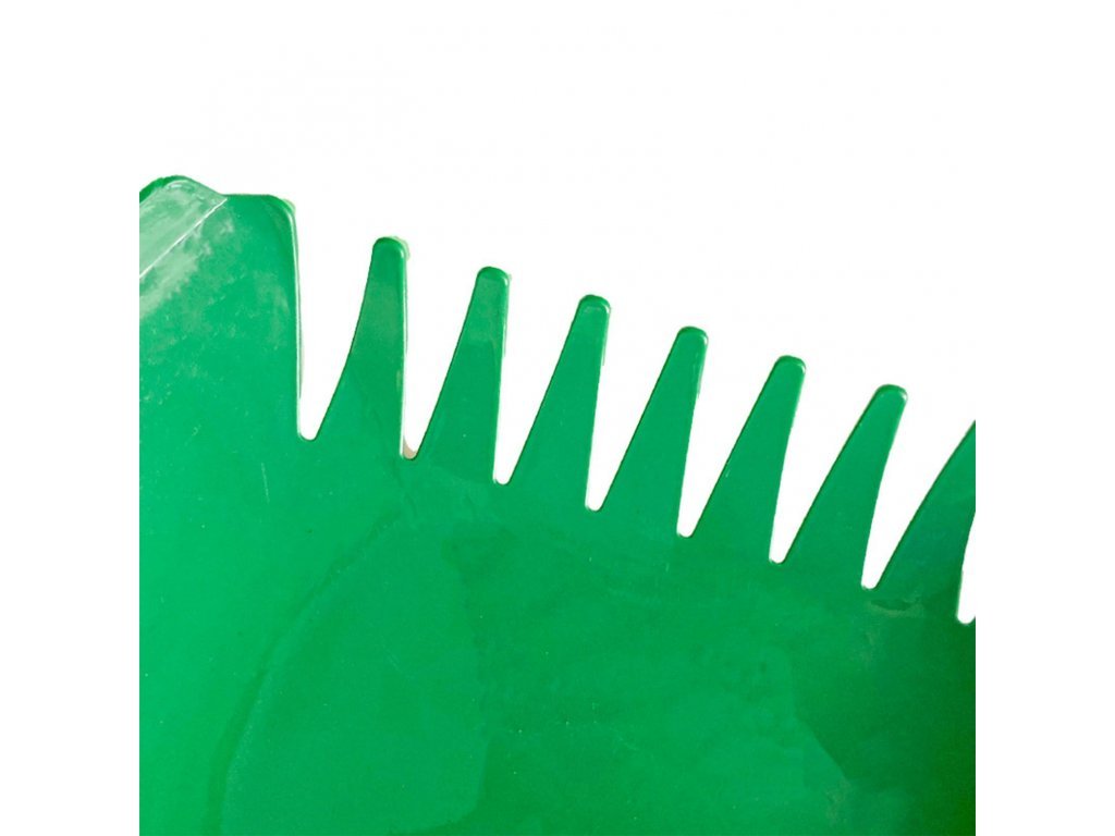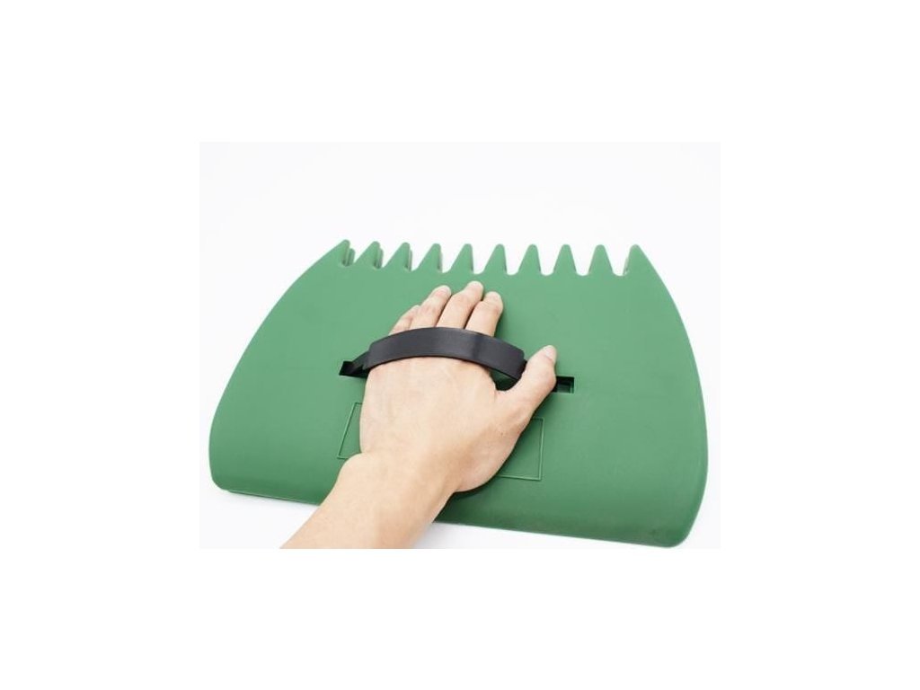 Mérete 34 x 25 cm, és a fogantyúknak köszönhetően lenyűgözően könnyen kezelhető. Ezen kívül az egyik oldalán kivágások vannak, amelyek egy gereblye fogaira emlékeztetnek. Ez természetesen óriási mértékben megkönnyíti a zöld növényzet kikotorását a földből, és az utolsó levelek eltávolítását is a fűből.