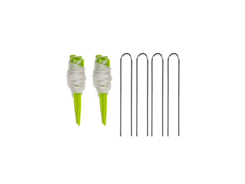 Összeszerelés közben semmi sem fog hiányozni. A készlet tartalmaz egy rögzítőrendszert is csapok és zsinórok formájában, amelyekkel a röplabdaháló tökéletesen stabillá válik még füves felületen is.