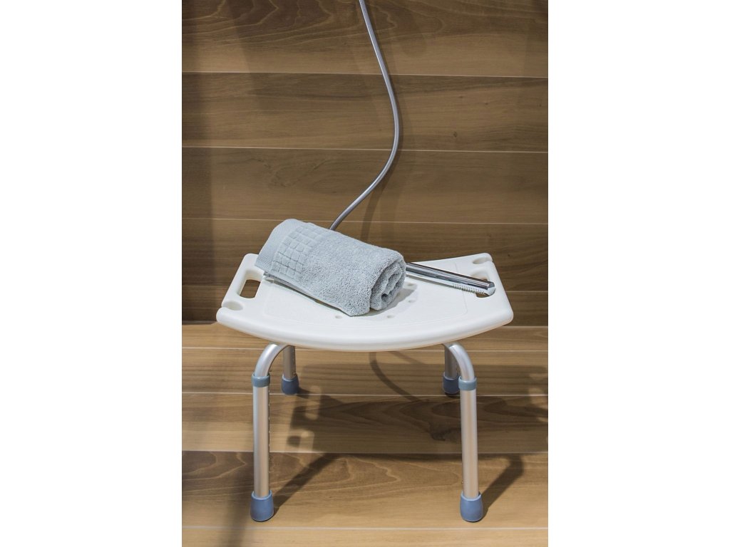 A zuhanyfotel oldalsó fogantyúkkal rendelkezik, amelyek megkönnyítik az ülést és az állást . Az ülőkében vízelvezető lyukak találhatók, hogy megakadályozzák a víz felgyülemlését . A zuhanyfej tartó növeli a kényelmet, és kiváló megoldás a mozgáskorlátozottak számára.