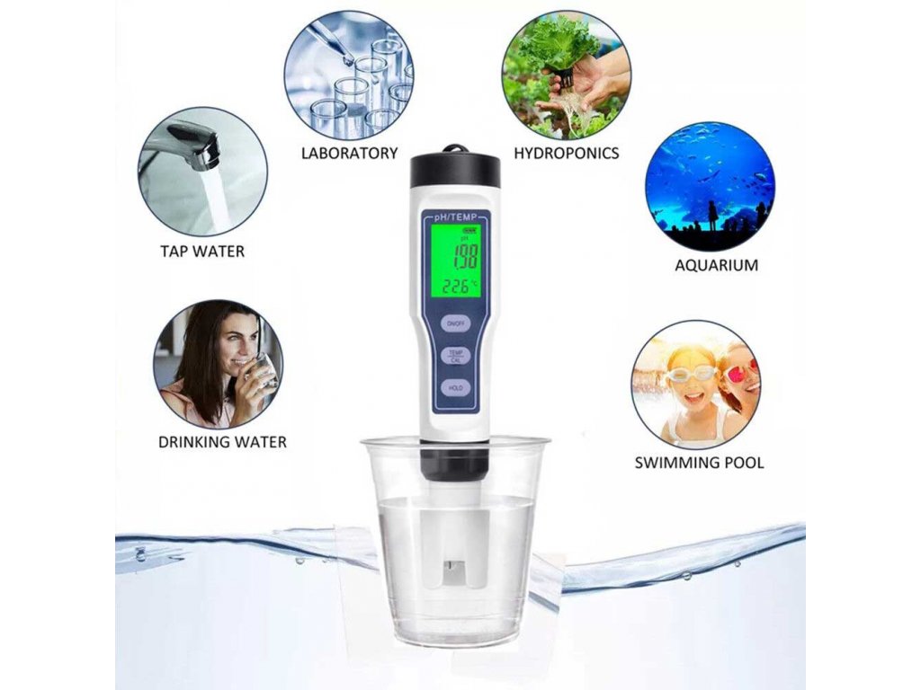 Az egyedülálló digitális vízvizsgálót úgy tervezték, hogy a víz pH-értékét 0,00 és 14 pH közötti tartományban vizsgálja. Automatikusan méri a hőmérsékletet, ahol a leolvasott értéket °C vagy F egységben találja.