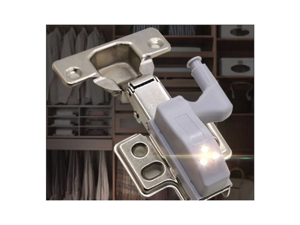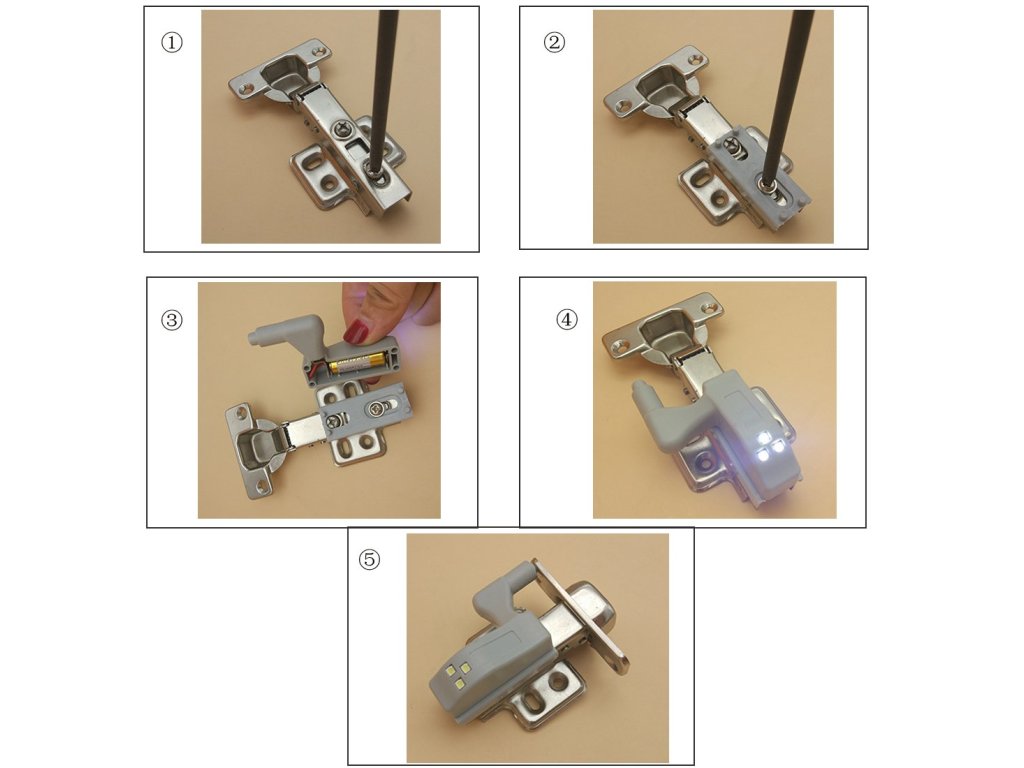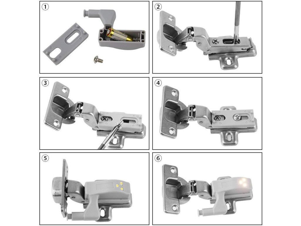 A világítás felszerelése gyors és rendkívül egyszerű. Egyszerűen helyezze be az elemeket, és rögzítse az ajtópántok csavarjaival. Szükség esetén a lámpa a zsanérokon kívülre is csavarozható - közvetlenül a szekrény falára.