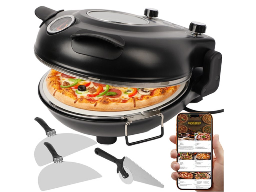 Az elektromos pizzasütő tepsi gombokkal rendelkezik az idő és a hőmérséklet beállításához. Így könnyen beállíthatja a sütés intenzitását. Akár 5 hőmérsékleti szint közül választhat, és a fedélen található praktikus hőmérővel is ellenőrizheti.