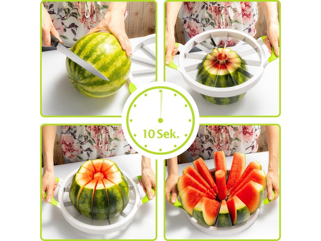 Ezzel a praktikus görögdinnye szeletelővel másodpercek alatt készíthet friss gyümölcsdarabokat. A görögdinnye mellett ananász, nagy alma vagy más nagy gyümölcsök szeletelésére is alkalmas. Ideális családi ünnepségekre, grillezésekre vagy nyári piknikekre, ahol ínyenc élményben lehet része.
