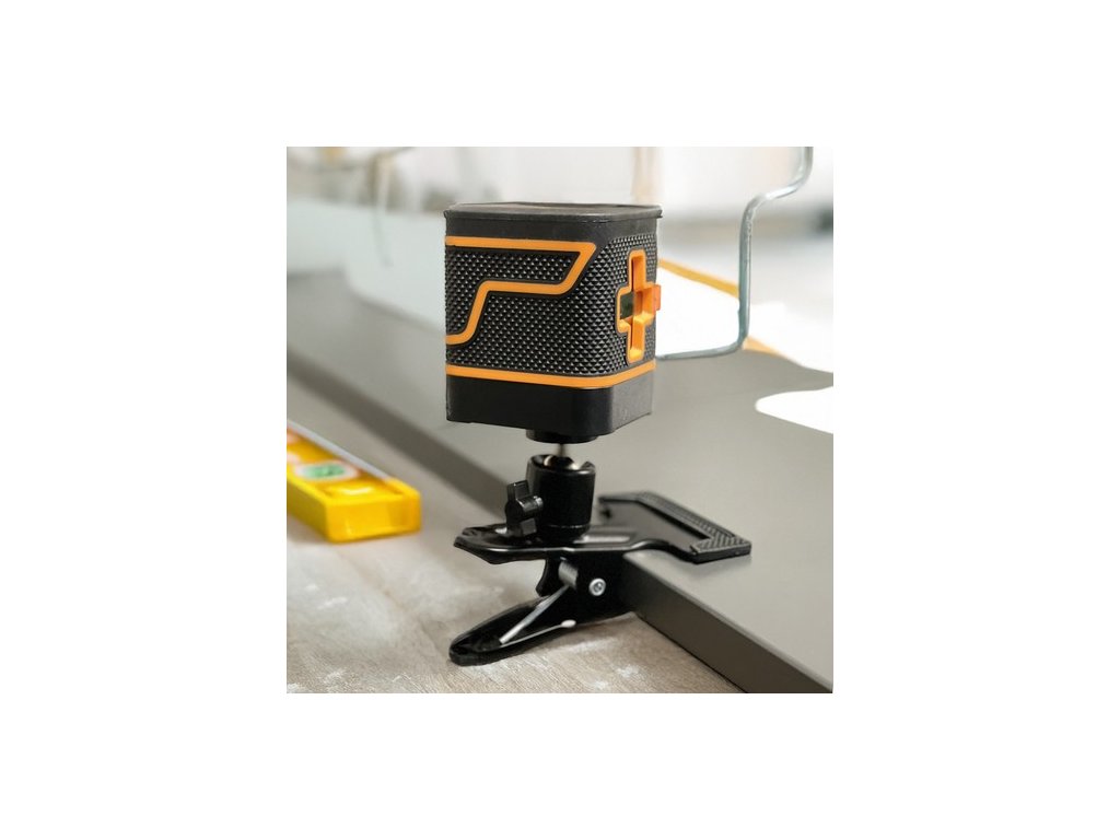 A készlet tartalmaz egy állítható, forgatható fejű tartót, amely lehetővé teszi a készülék egyszerű rögzítését különböző felületekre. Ezzel a funkcióval pontosan oda irányíthatja a lézert, ahová szüksége van rá. A tartó csúszásgátló betétekkel van ellátva, amelyek megakadályozzák a felület karcolódását és biztosítják a stabilitást.